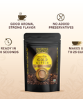 Carefully handpicked premium Robusta beans from South Indian coffee estates, roasted to perfection for an aromatic and smooth experience. These beans are then finely ground and blended with high-quality chicory in a precise 53:47 ratio—bringing out a warm, full-bodied texture that’s distinctly South Indian. Our instant blend is crafted in small batches to retain its freshness and aroma. Each batch is free from preservatives and additives, lab-tested to ensure purity and consistency, before it is packaged with love and sincerity.