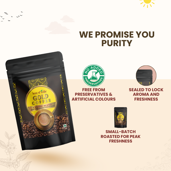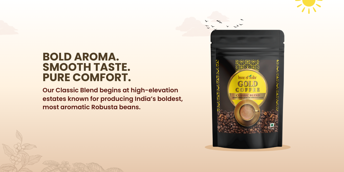 Experience the rich, bold flavour of Love of India Gold Coffee, a premium instant coffee chicory blend crafted for coffee lovers who crave the comfort of tradition and the rich aroma of Indian Coffee.