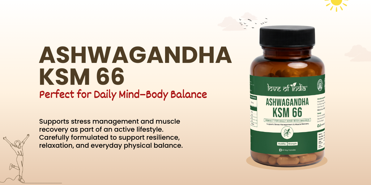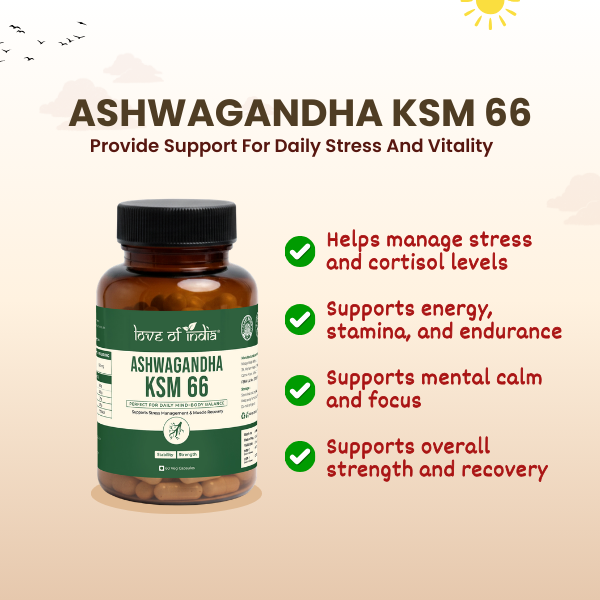 In today’s fast-paced lifestyle, stress and fatigue often disrupt our natural balance. Love of India Ashwagandha KSM-66 is designed to support daily mind-body harmony using one of the most researched and trusted forms of Ashwagandha. Made with KSM-66® Ashwagandha root extract, this formulation supports stress management, muscle recovery, and overall stability thus helping you stay strong, calm, and consistent every day.
