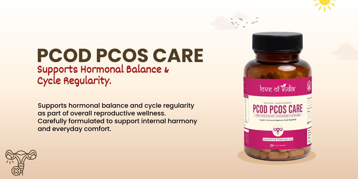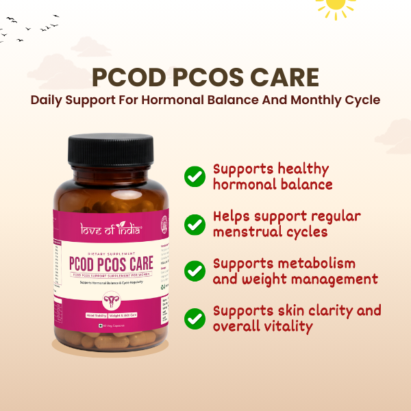 Hormonal imbalance and irregular cycles can affect a woman’s overall health, mood, skin, and confidence. Managing PCOD/PCOS requires consistent lifestyle support and the right nutritional care. Love of India PCOD PCOS Care Capsules are thoughtfully formulated to support hormonal balance, cycle regularity, and overall women’s wellness as part of a balanced daily routine.