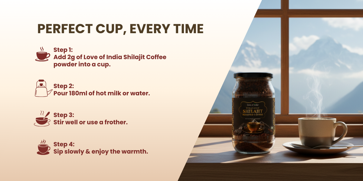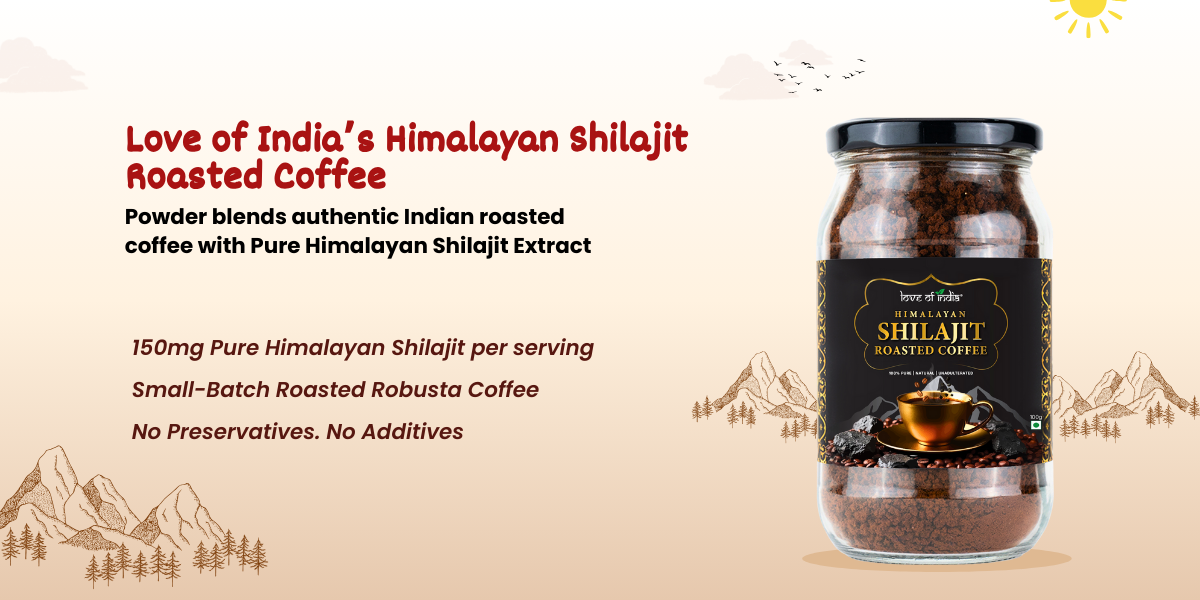 Indulge in the perfect blend of energy and wellness with Love of India Shilajit Coffee, a premium brew enriched with pure Himalayan Shilajit. Every sip delivers a rich, aromatic coffee experience while naturally boosting stamina, strength, and vitality. It’s more than just coffee it’s your daily dose of rejuvenation.