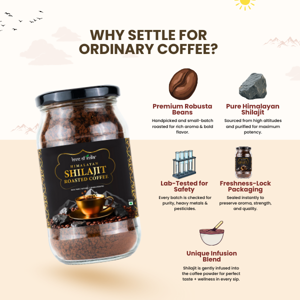 We start with handpicked premium Robusta beans, carefully roasted to perfection for a rich and aromatic flavor. Pure Himalayan Shilajit, sourced from pristine altitudes, is meticulously purified and blended with the coffee powder. This unique infusion process ensures every cup delivers the perfect balance of taste and wellness, without compromising on quality. Each batch undergoes rigorous lab testing to ensure purity, potency, and freedom from pesticides or heavy metals.