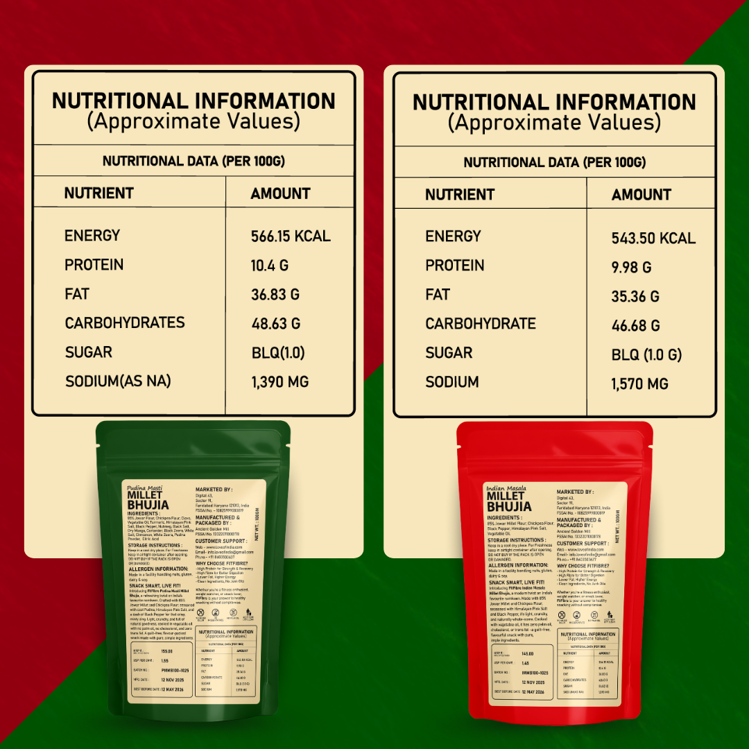 FitFibre Assorted Millet Bhujia Pack brings together two Pudina Masti Millet Bhujias and one Indian Masala Millet Bhujia, giving you a refreshing, crunchy, and healthy snacking experience. Made with 85% Jowar Millet and Chickpea Flour, this combo is perfect for fitness lovers, mindful eaters, and anyone who wants guilt-free flavour with real nutrition.