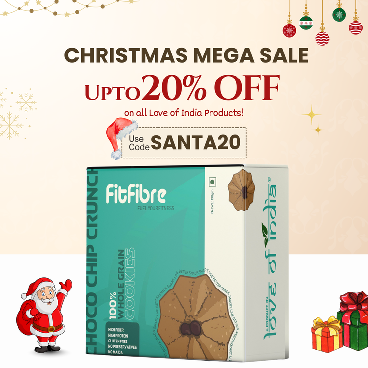 FitFibre Choco Chip Crunch Cookies are Gluten Free made with 100% whole grain flour (Jowar & Bajra), rich in fiber and protein, and free from maida and preservatives. Packed with the crunch of real choco chips, these cookies are the perfect balance of taste and nutrition for your everyday snacking.