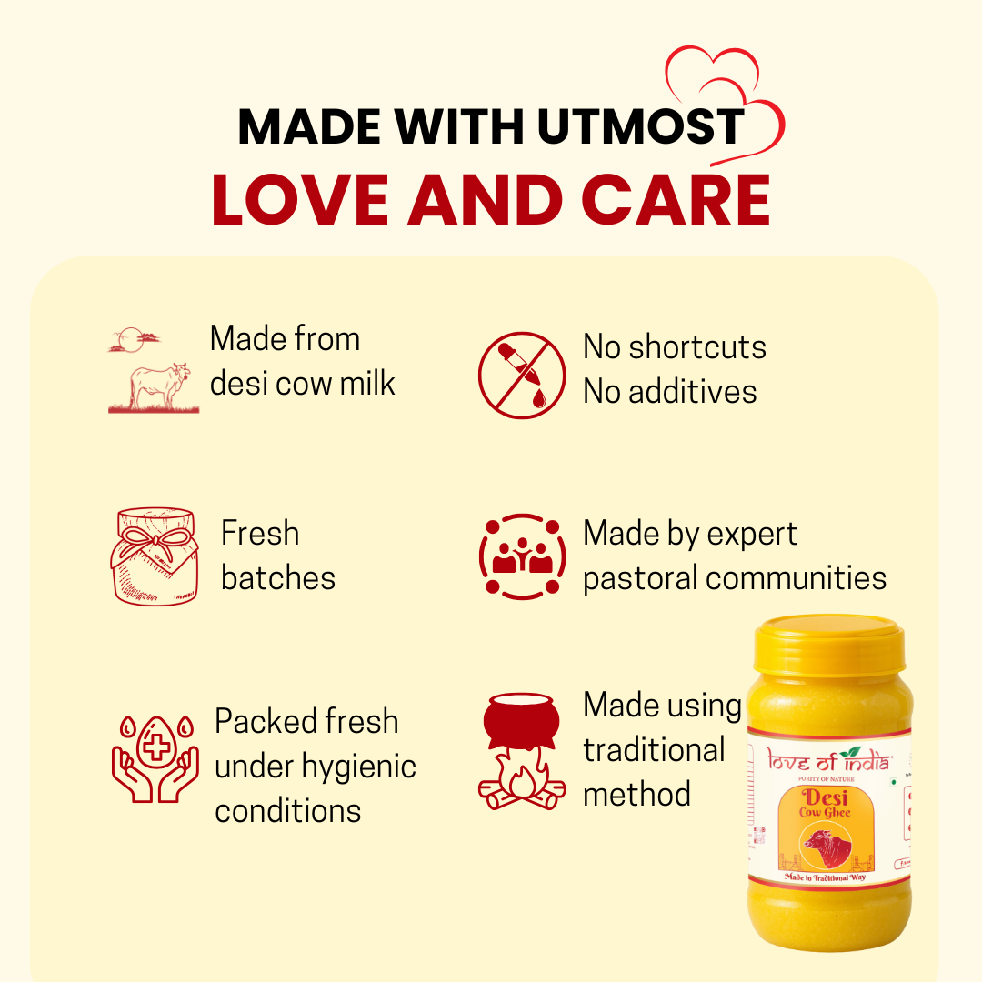 Experience purity with Love of India Desi Cow Ghee, made from the milk of native Indian (A2) cows in Gujarat. Made with Traditional method, this ghee is rich in aroma, tradition, and nourishment.